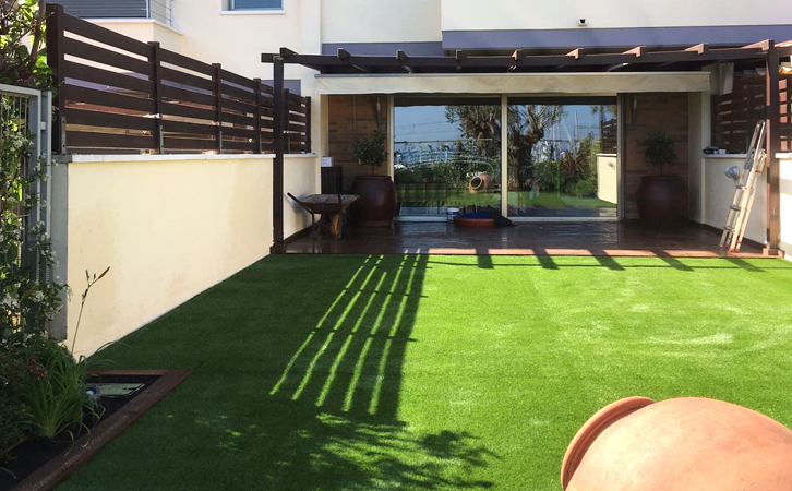Preparació del terreny per a instal·lació de gespa artificial, instal·lació de sistema de reg gota a gota. Col·locació de tarima sintètica Supradeck Capsule al jardí ubicat a Sant Andreu de Llavaneres.